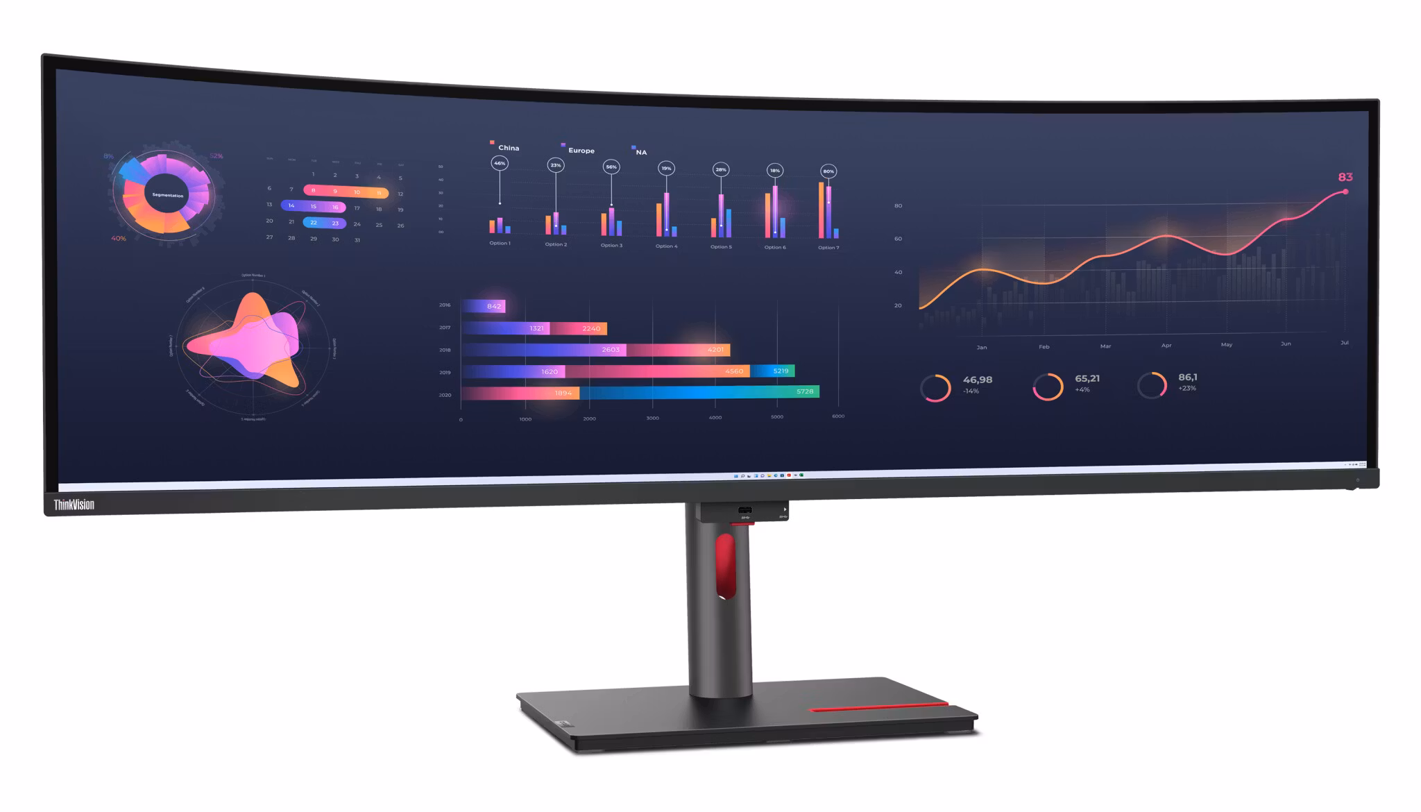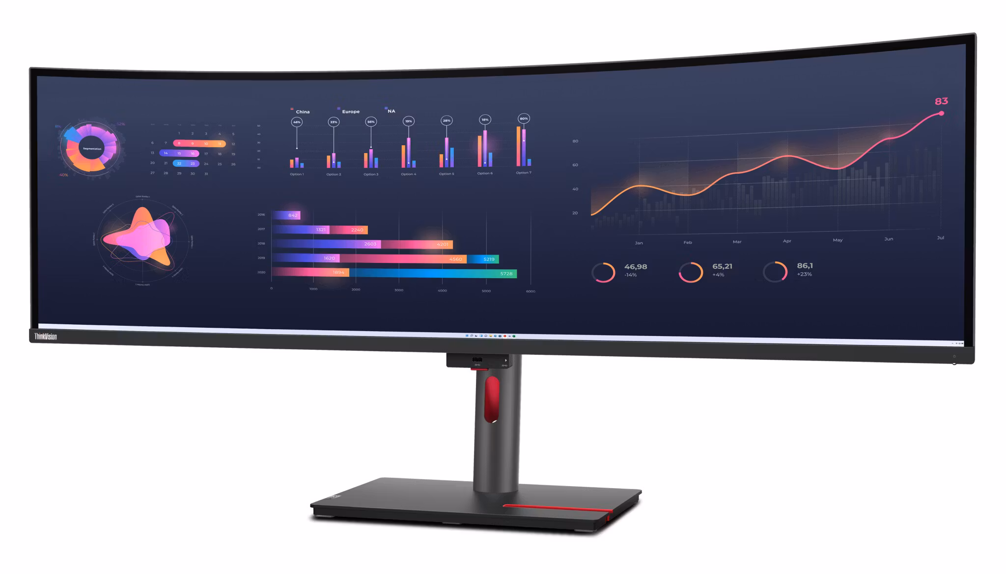 Multitasking är enkelt med Lenovo ThinkVision P49w-30, som sätter produktivitet i första hand. Den 125 cm (49\") IPS-panelen med en upplösning på 5 120 x 1 440 pixlar ger uttrycksfulla, synliga detaljer för alla öppna applikationer, och den är böjd i en radie av 3,800R så att inga detaljer går förlorade var du än tittar. Lenovo ThinkVision P49w-30 har en ergonomiskt utformad ställning och kan därför justeras i höjd, lutar framåt eller bakåt och svängas både åt vänster och höger, och den levererar också blixtsnabba överföringshastigheter tack vare Thunderbolt 4.