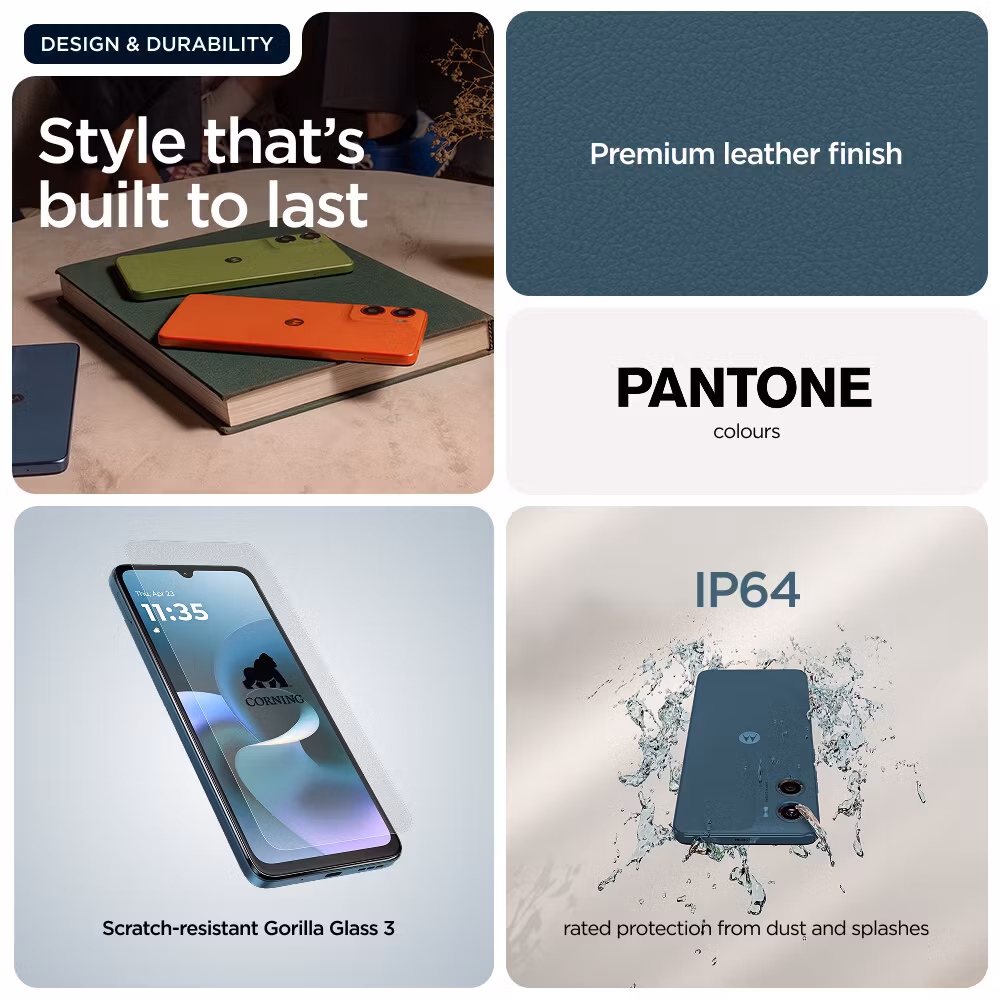 Motorola moto G06 är byggd med fokus på hållbarhet. Den är IP64-klassad, vilket innebär skydd mot damm och vattenstänk, och har en konstruktion som klarar vardagligt slitage väl. Baksidan kombinerar konstläder och plast, vilket ger både ett förbättrat grepp och ett mer exklusivt utseende i färgen Blågrön (Tapestry).