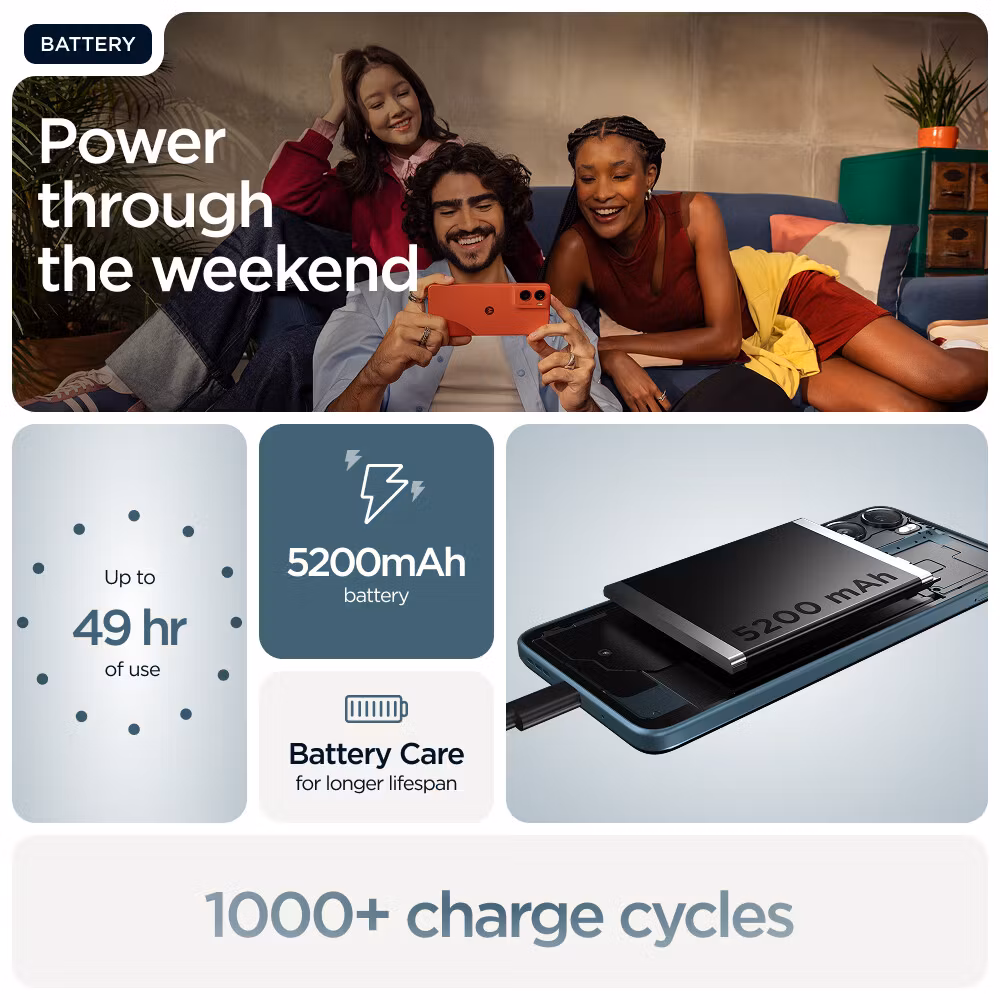 Batteritiden är en av modellens största styrkor och gör att användaren kan förlita sig på telefonen under hela dagen – ofta längre – utan laddning. Den långsamma laddningen bidrar till batteriets livslängd och gör moto G06 till ett hållbart val även ur miljösynpunkt.