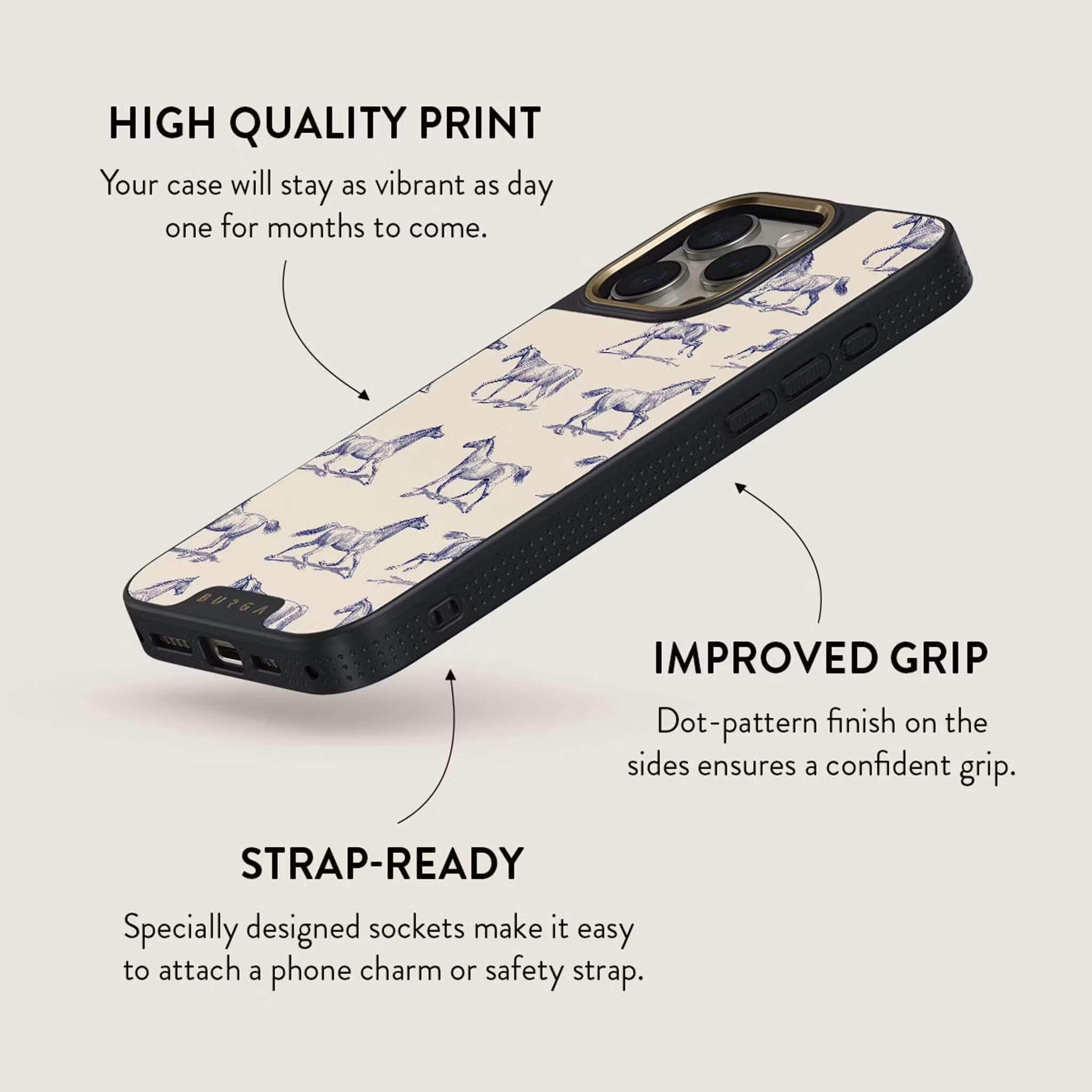 Burga Derby Race – Apple iPhone 16 Pro Max Skyddsskal Elite MagSafe Svart/Guld är ett exklusivt mobilskal utvecklat för att kombinera en lyxig design med ett avancerat skyddssystem för daglig användning. Skalet är specifikt framtaget för iPhone 16 Pro Max och har en exakt passform som gör att alla knappar, portar och funktioner kan användas utan begränsningar. Genom att integrera MagSafe-kompatibilitet i en förstärkt konstruktion skapas ett tillbehör som både skyddar telefonen och gör den mer flexibel i vardagen.