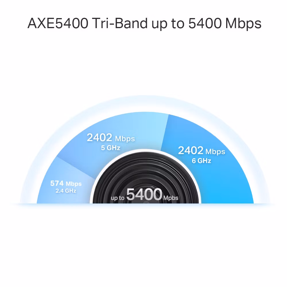 Tri-band arkitekturen använder frekvenserna 2.4 GHz, 5 GHz och 6 GHz, vilket ger bättre belastningsfördelning och mer stabil uppkoppling för flera samtidiga enheter. Det dedikerade 6 GHz-bandet möjliggör snabb dataöverföring med låg latens, vilket är särskilt fördelaktigt för 4K-streaming, videomöten, gaming och smarta hem-enheter.