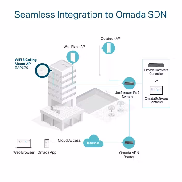 Centraliserad moln/localkontroll via Omada gör nätverkshantering enklare, även för flera enheter och platser.