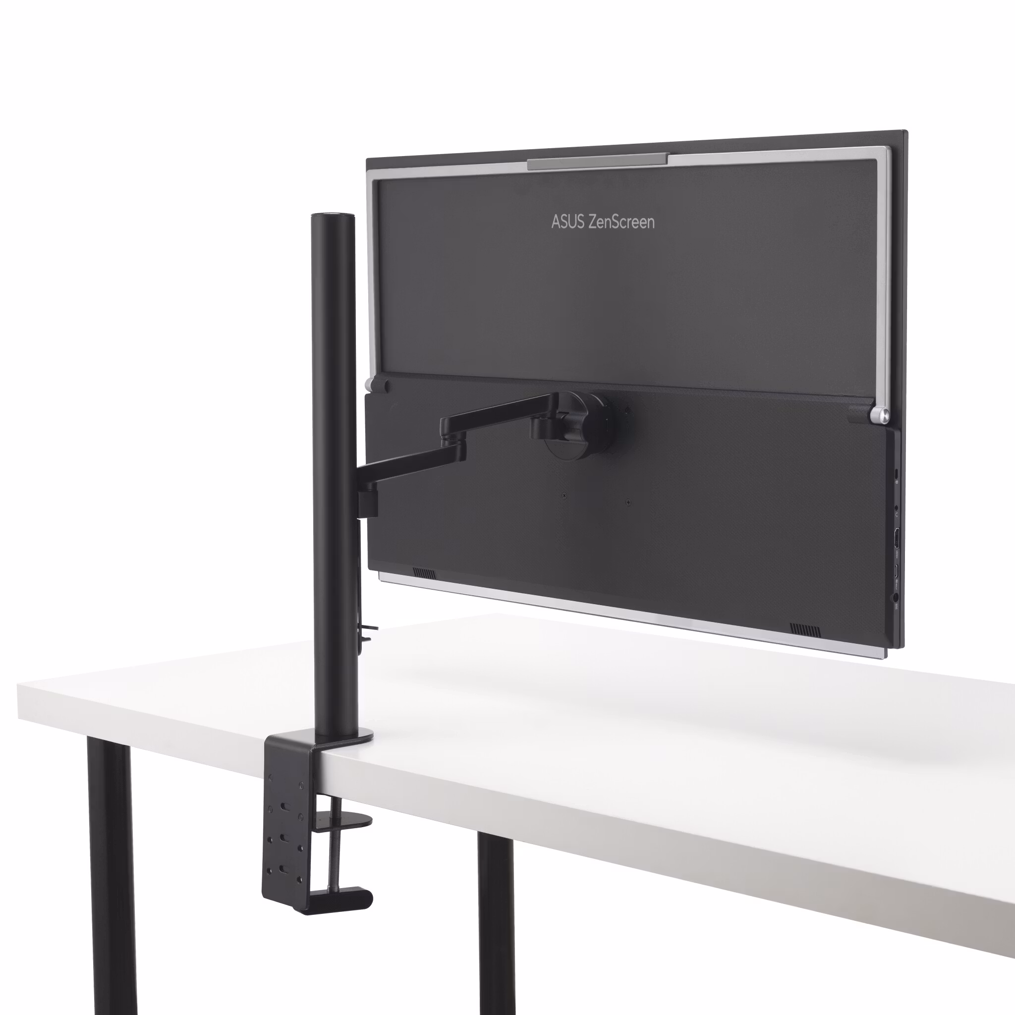 Den integrerade stödbenkonstruktionen gör att skärmen kan placeras stabilt på olika underlag utan behov av separat stativ. Samtidigt erbjuder den full justerbarhet med höjd, tilt, vridning och pivot, vilket är ovanligt för en bärbar modell och gör det möjligt att anpassa arbetsställningen ergonomiskt.
