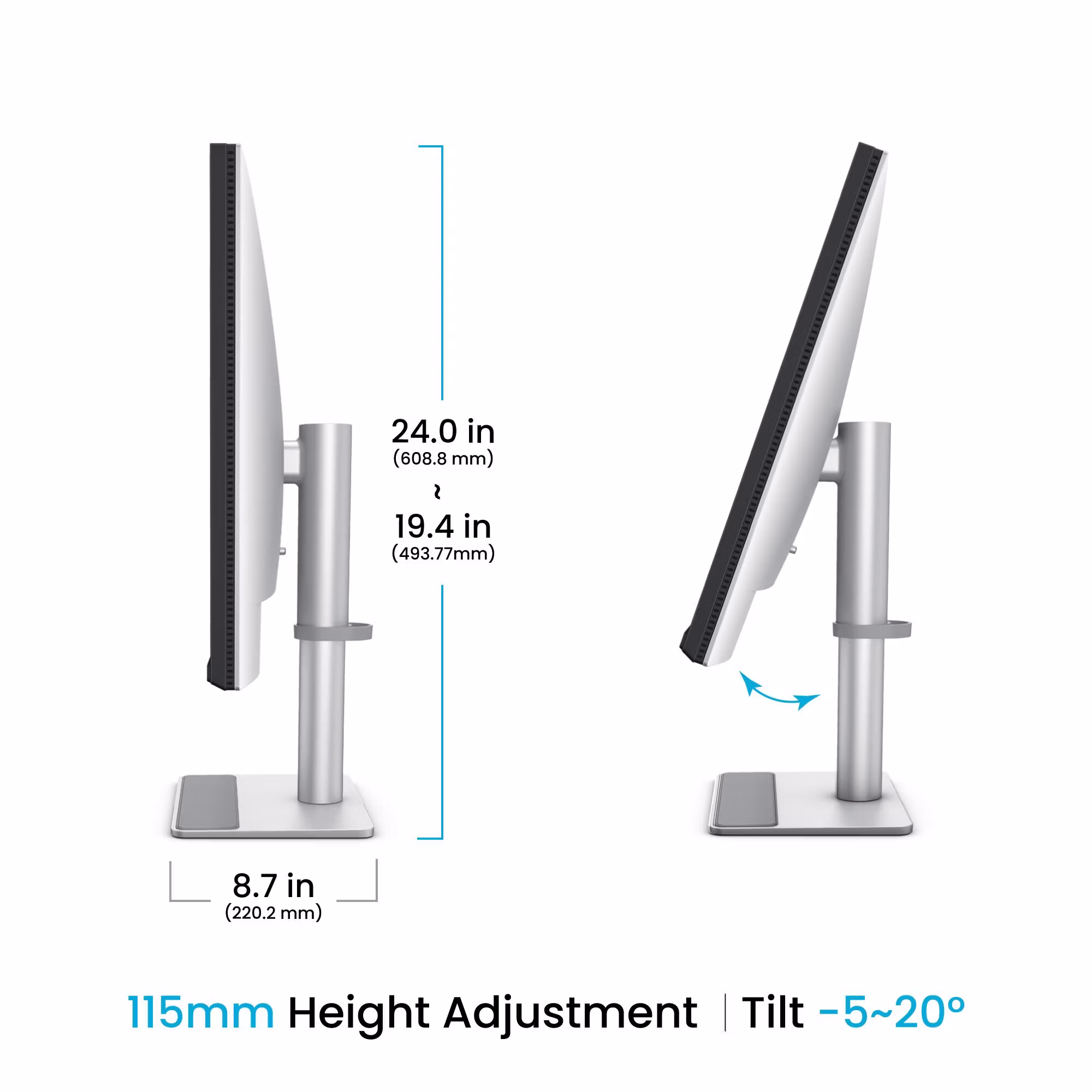 Ergonomi: höjdjustering (~115 mm), tilt –5° till +20°, swivel ±15°, pivot 90°, VESA-montering 100 × 100 mm – flexibel installation.