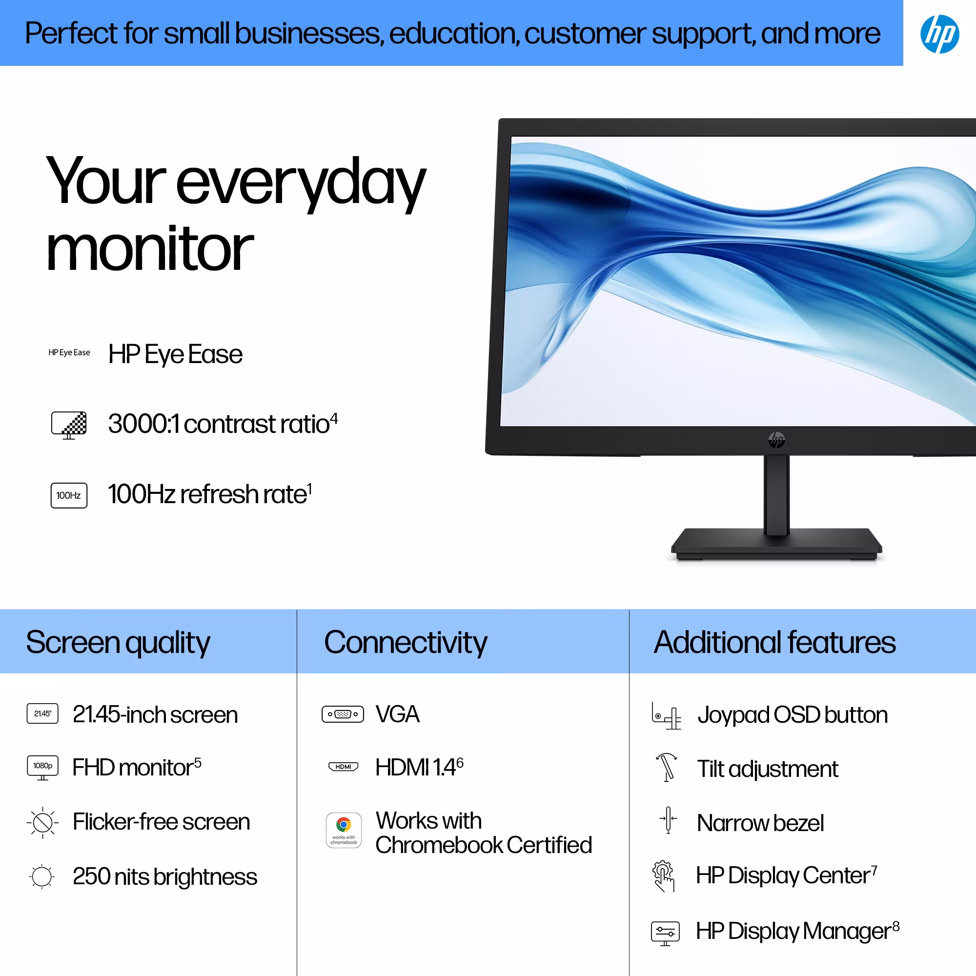 HP Series 3 Pro FHD Monitor 322pv 21.4" VA Monitor är en kompakt och energieffektiv bildskärm som är utvecklad för dagligt arbete, studier och allmän datoranvändning. Med en Full HD-upplösning på 1920 x 1080 pixlar erbjuder skärmen en tydlig och skarp bild som lämpar sig väl för dokumenthantering, webbsurfning, videovisning och administrativa arbetsuppgifter. Den smidiga storleken på 21,4 tum gör modellen idealisk för arbetsplatser där utrymme är begränsat men där hög bildkvalitet fortfarande är viktigt.