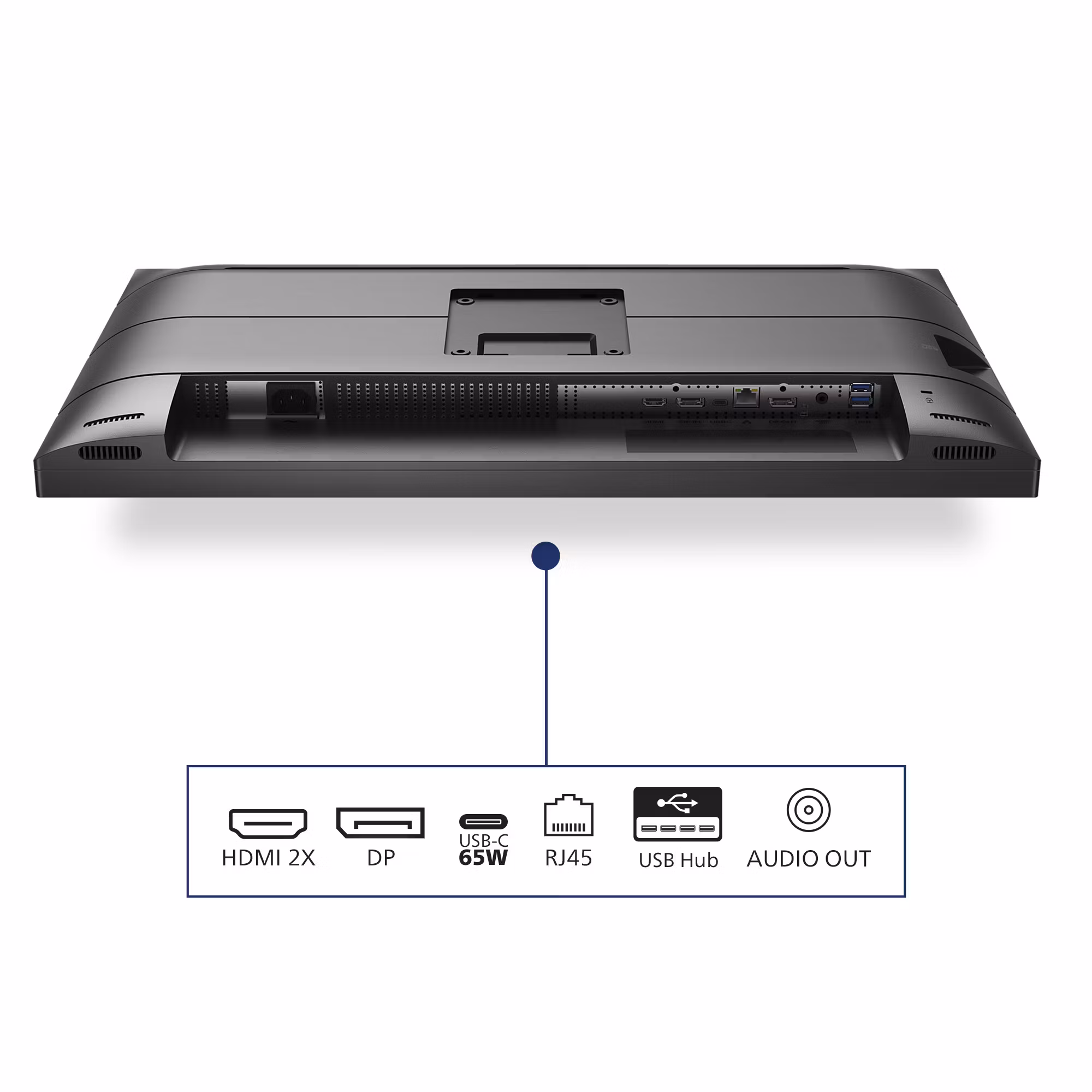 Anslutningsmöjligheterna är moderna och många – inklusive HDMI, DisplayPort och USB-C med strömförsörjning upp till 65 W, vilket ger dig möjlighet att ansluta laptop och få både bild och laddning via en enda kabel. Inbyggd USB-hub och nätverk via RJ-45 finns också som alternativ – vilket förenklar anslutning av kringutrustning och kabelhantering.