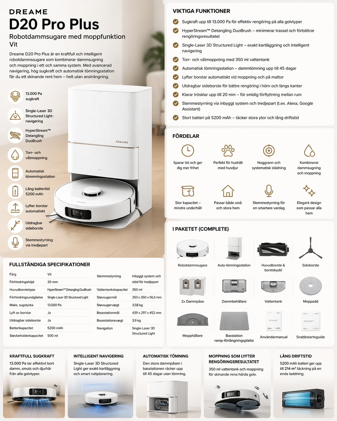 Dreame D20 Pro Plus Robotdammsugare med moppfunktion Vit är en kraftfull och intelligent robotdammsugare som kombinerar effektiv sugteknik, avancerad navigation och automatisk tömning i ett komplett system. Den är utformad för att ge en smidig och automatiserad städupplevelse där både dammsugning och moppning sker i ett och samma arbetsmoment. Den stilrena vita designen gör att den passar naturligt in i moderna hem.