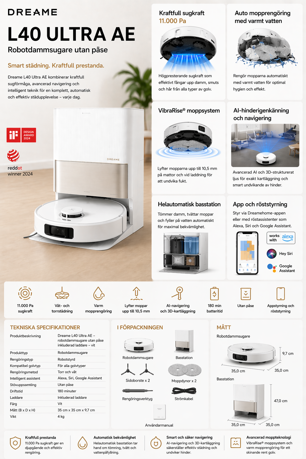 Dreame L40 Ultra AE Robotdammsugare utan påse Vit är en avancerad och helautomatisk städlösning som kombinerar kraftfull sugförmåga, intelligent navigation och ett komplett moppsystem. Den är utvecklad för att leverera både dammsugning och våtrengöring i ett och samma system, vilket gör den till ett optimalt val för hushåll som vill automatisera sin städning med minimal ansträngning. Den stilrena vita designen gör att den smälter in naturligt i moderna hem.