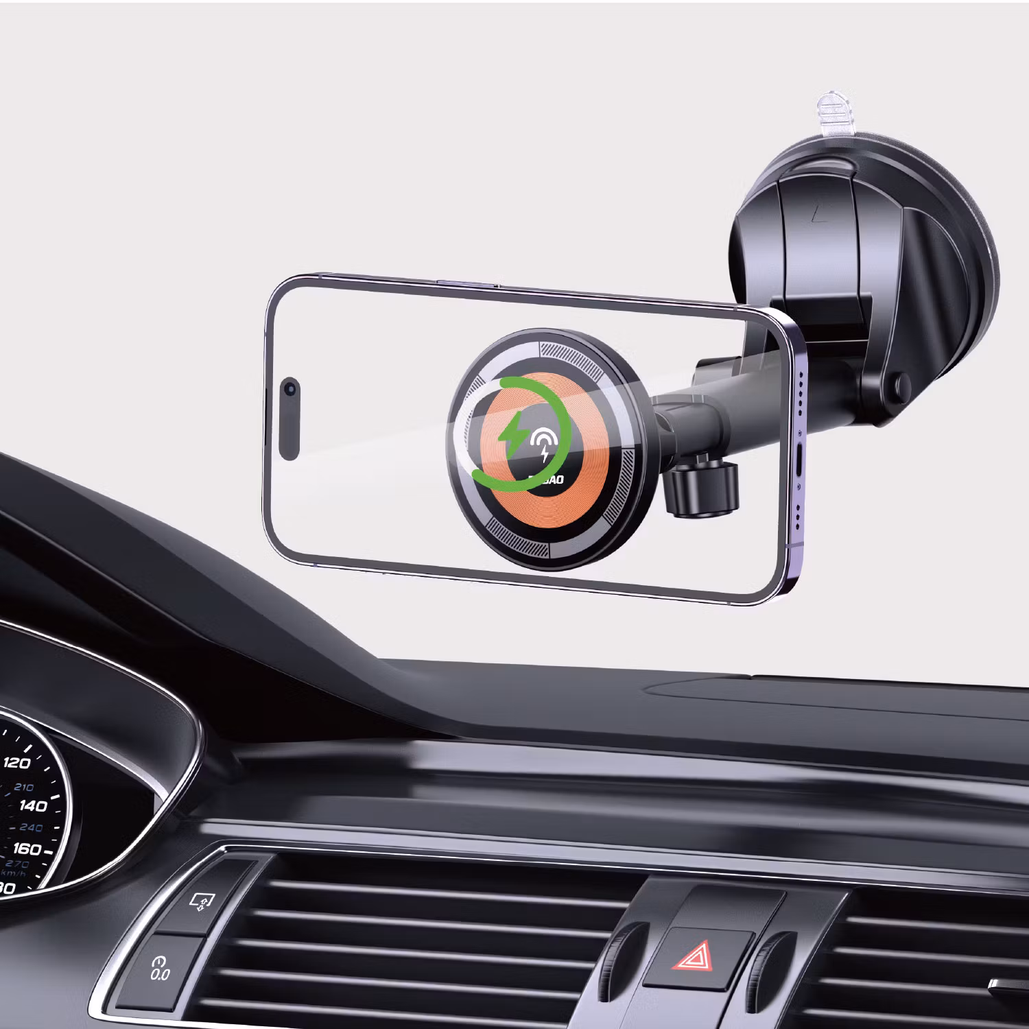 MagSafe-kompatibel magnetisk mobilhållare som gör att telefonen snabbt och säkert fäster på hållaren utan mekaniska klämmor.