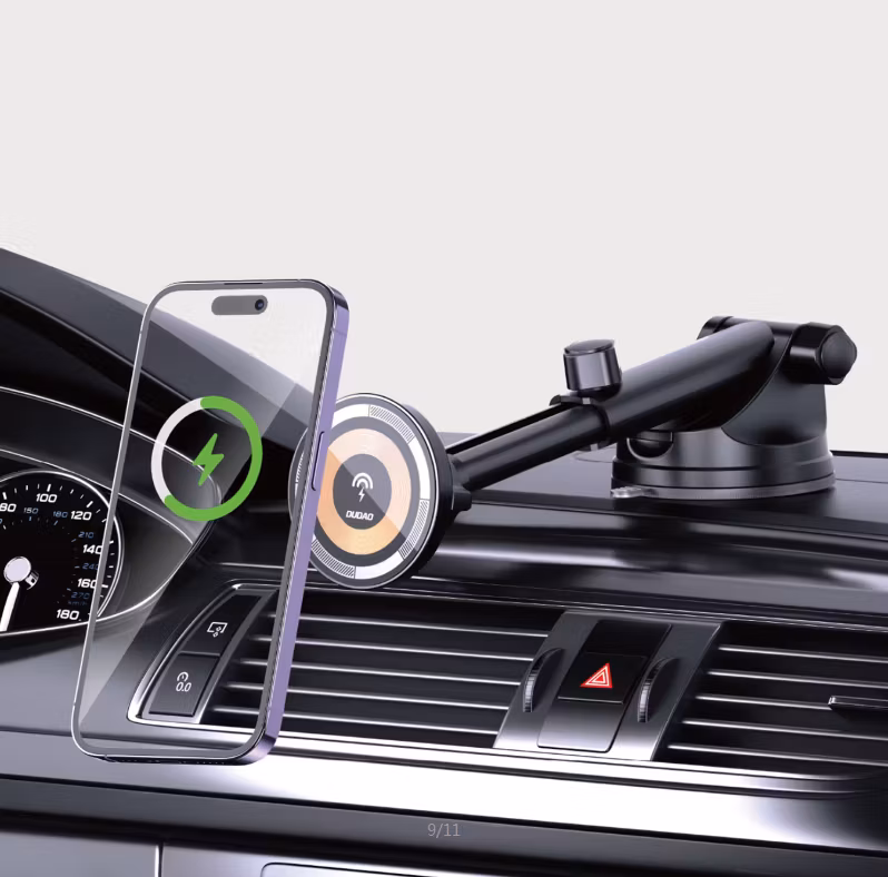 Dudao MagSafe Bilhållare Cockpit Magnetisk Svart är en modern mobilhållare som kombinerar magnetisk MagSafe-teknik, stabil cockpitmontering och integrerad trådlös laddning i en enda praktisk lösning. Den är utvecklad för att göra användningen av smartphones i bilen både enklare och säkrare, samtidigt som den håller enheten laddad under körningen.