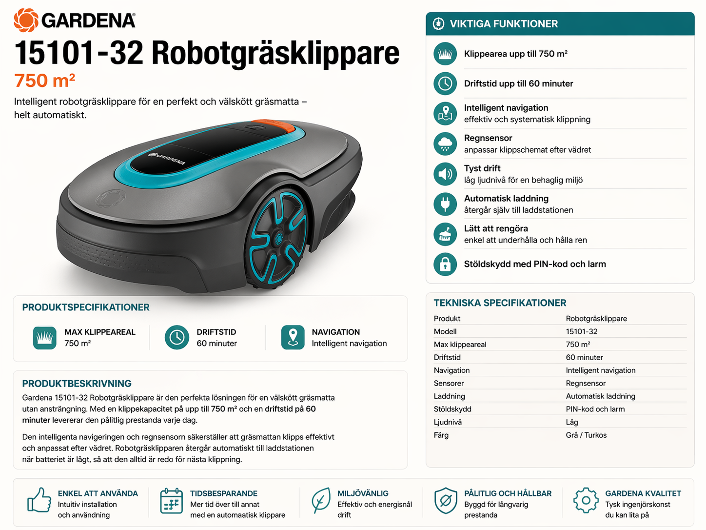 Gardena 15101-32 Robotgräsklippare är en smart och praktisk lösning för dig som vill ha en välskött gräsmatta utan att behöva lägga tid på manuell klippning. Den är anpassad för trädgårdar upp till 750 m² och levererar ett jämnt och professionellt resultat.