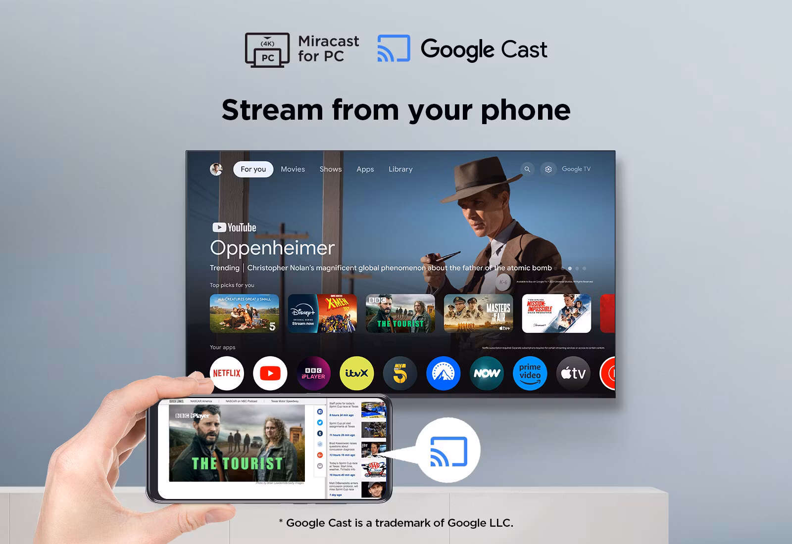 Med Google TV samlas alla appar, streamingtjänster och rekommendationer på ett och samma ställe. Direktstöd för Netflix, YouTube, Prime Video och Apple TV+ gör att du snabbt kommer igång. Inbyggt Wi-Fi, LAN och Bluetooth ger flexibel anslutning till nätverk och trådlösa tillbehör, medan Google Assistant möjliggör röststyrning där språket stöds.