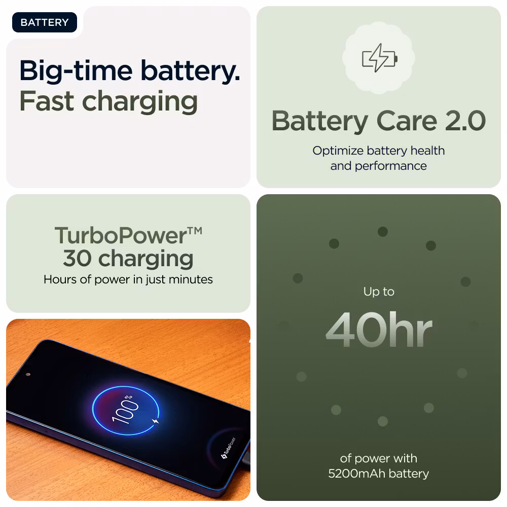 Prestandan drivs av MediaTek Dimensity 7060, en modern åttakärnig processor med en klockfrekvens på upp till 2,6 GHz. Processorn är optimerad för energieffektivitet och stabil drift, samtidigt som den erbjuder fullt stöd för 5G-uppkoppling. Tillsammans med 8 GB RAM hanterar Moto G56 smidigt multitasking, appar, streaming och daglig användning utan att kännas trög eller instabil. Telefonen är konstruerad för att leverera jämn prestanda även vid längre användningspass.