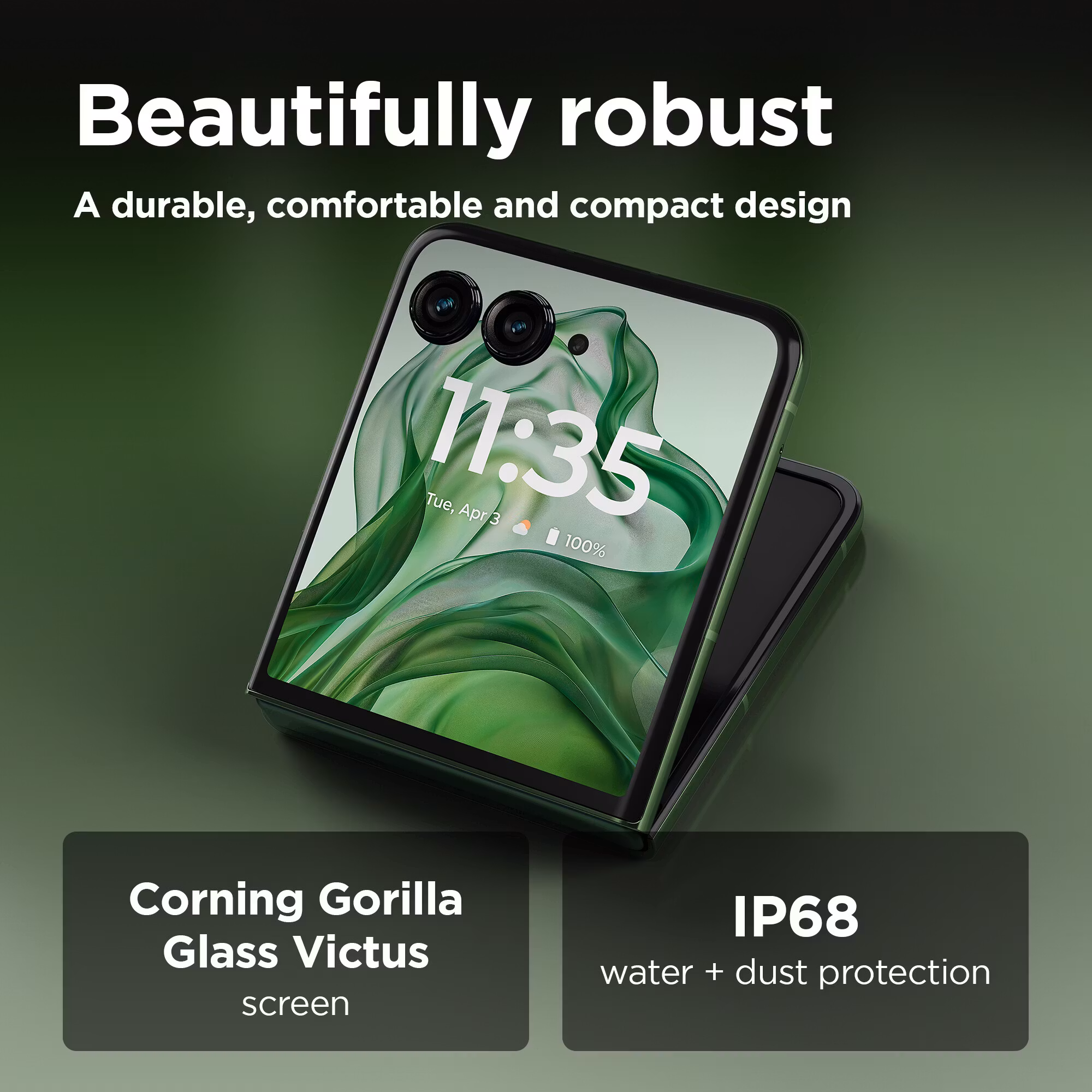 Designmässigt är modellen utförd i färgen Vårgrön, som ger ett fräscht och exklusivt intryck. Med en tjocklek på endast 7,09 mm i utfällt läge och en vikt på 189 gram är telefonen förvånansvärt smidig för sin storlek och tekniska nivå. Kombinationen av avancerad teknik och genomtänkt form gör Motorola RAZR 50 Ultra till ett tydligt stilstatement, lika mycket som ett arbetsverktyg.