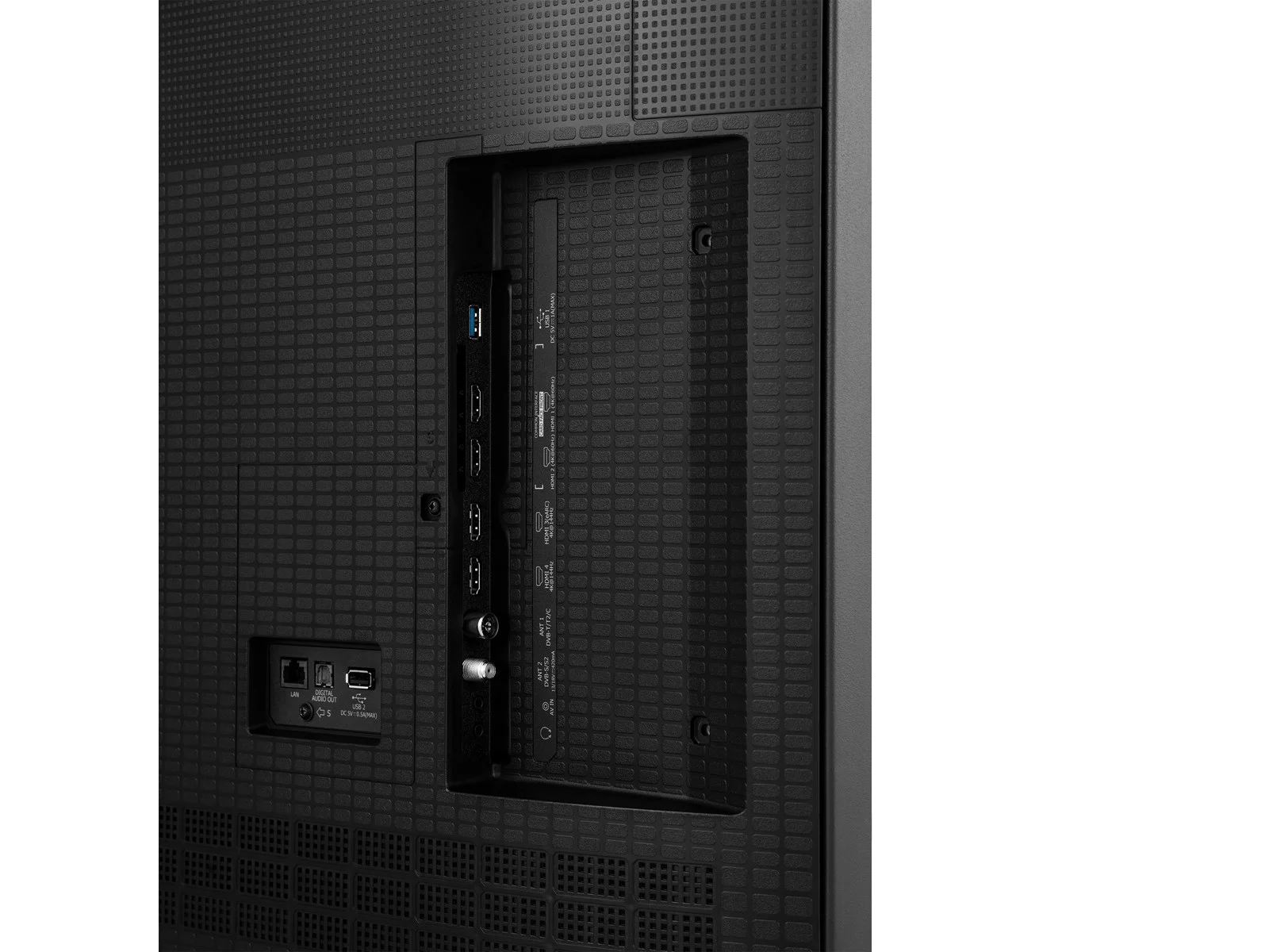 Anslutningsmöjligheterna är omfattande och inkluderar 4 HDMI-portar, USB, Wi-Fi, LAN och Bluetooth, vilket gör det enkelt att ansluta spelkonsoler, soundbars och externa lagringsenheter. TV:n har även stöd för digitala TV-standarder som DVB-T2, DVB-S2 och DVB-C, vilket gör den kompatibel med flera olika sändningsformat. Den integrerade ljudlösningen med 2 högtalare och bashögtalare ger ett fylligare ljud med bättre djup jämfört med standard-TV-högtalare.
