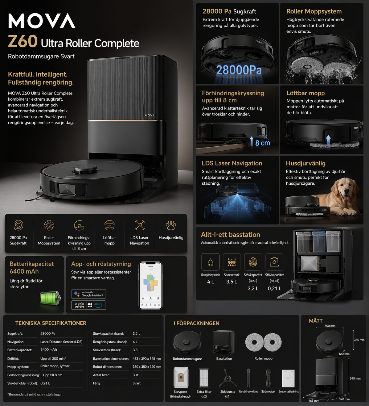 Sammanfattningsvis är MOVA Z60 Ultra Roller Complete ett premiumval för dig som vill ha maximal kraft, avancerad teknik och en helautomatiserad städlösning med hög kapacitet och flexibilitet.
