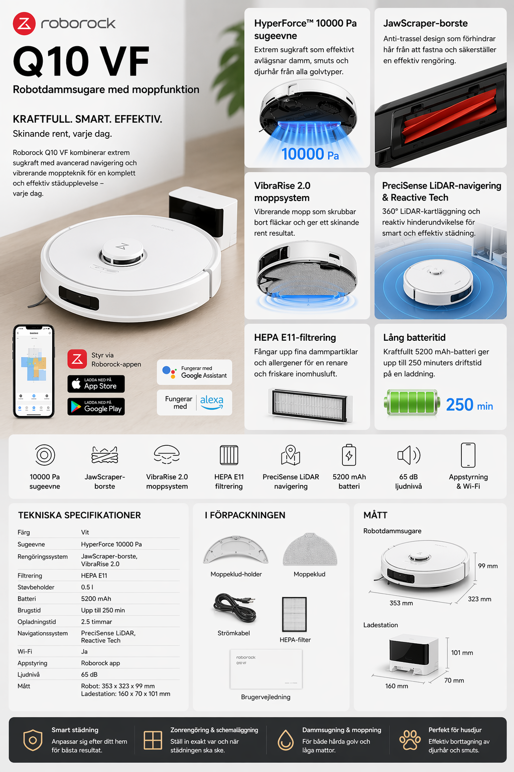 Sammanfattningsvis är Roborock Q10 VF ett utmärkt val för dig som vill ha en kraftfull, tyst och intelligent robotdammsugare med avancerad moppfunktion och hög användarvänlighet.