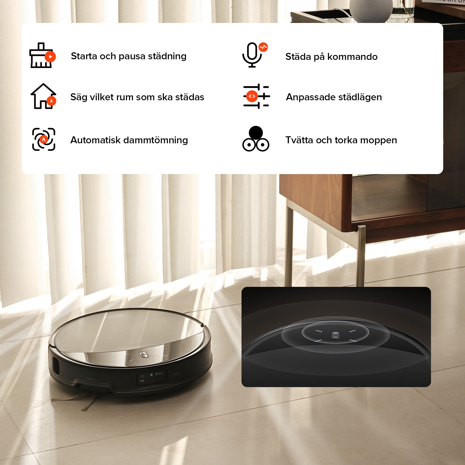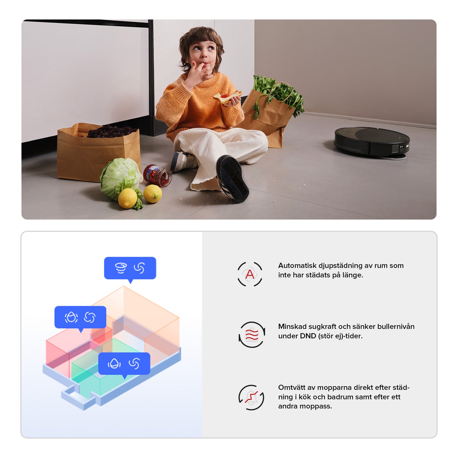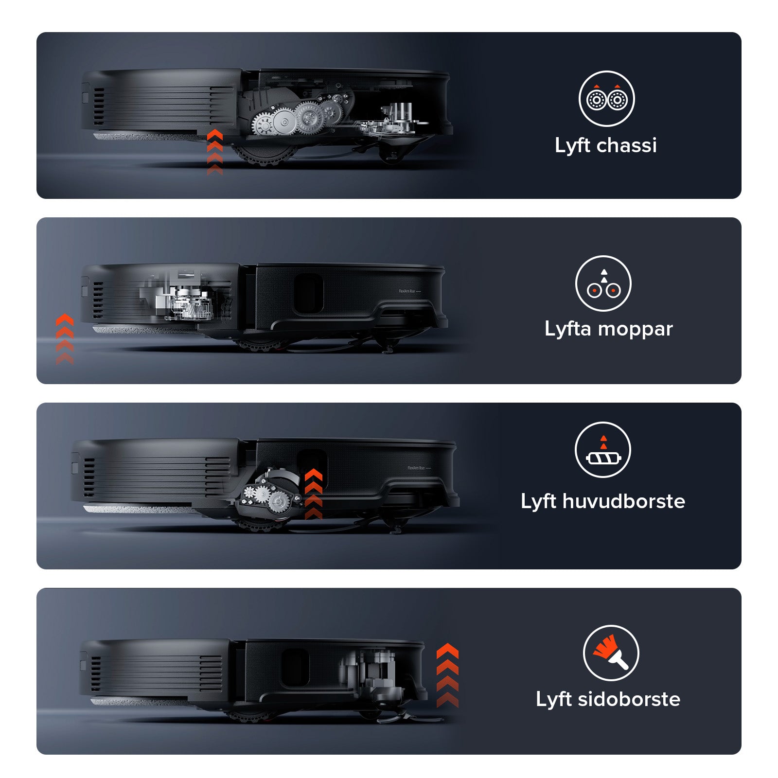 Den är designad för att uppfylla ditt hems unika behov där det lyftbara chassit, huvudborsten, sidoborsten och mopparna samarbetar för att ge en automatiserad och anpassad städning för olika situationer.