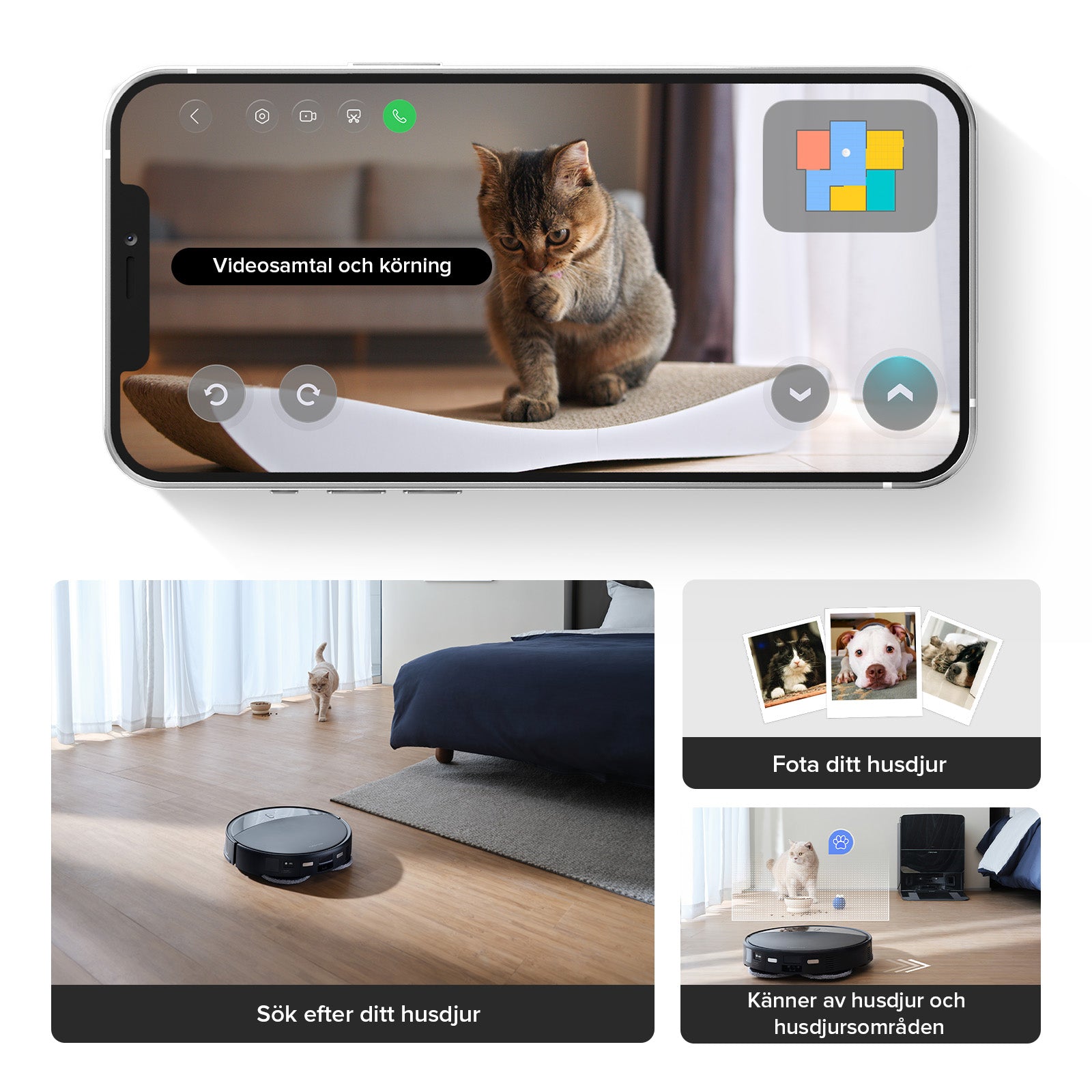 Roborock pausar automatiskt när den närmar sig husdjur för att inte skrämma dem och ökar sugkraften i närheten av djurmat för en djupare städning*. Du kan ta bilder av dina husdjur och spåra dem i appen. Om ditt husdjur gömmer sig kan roboten hjälpa dig att hitta det.