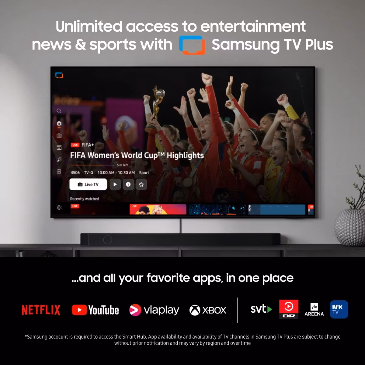 • Kostnadsfri tillgång till film, serier, sport och nyheter med Samsung TV Plus.